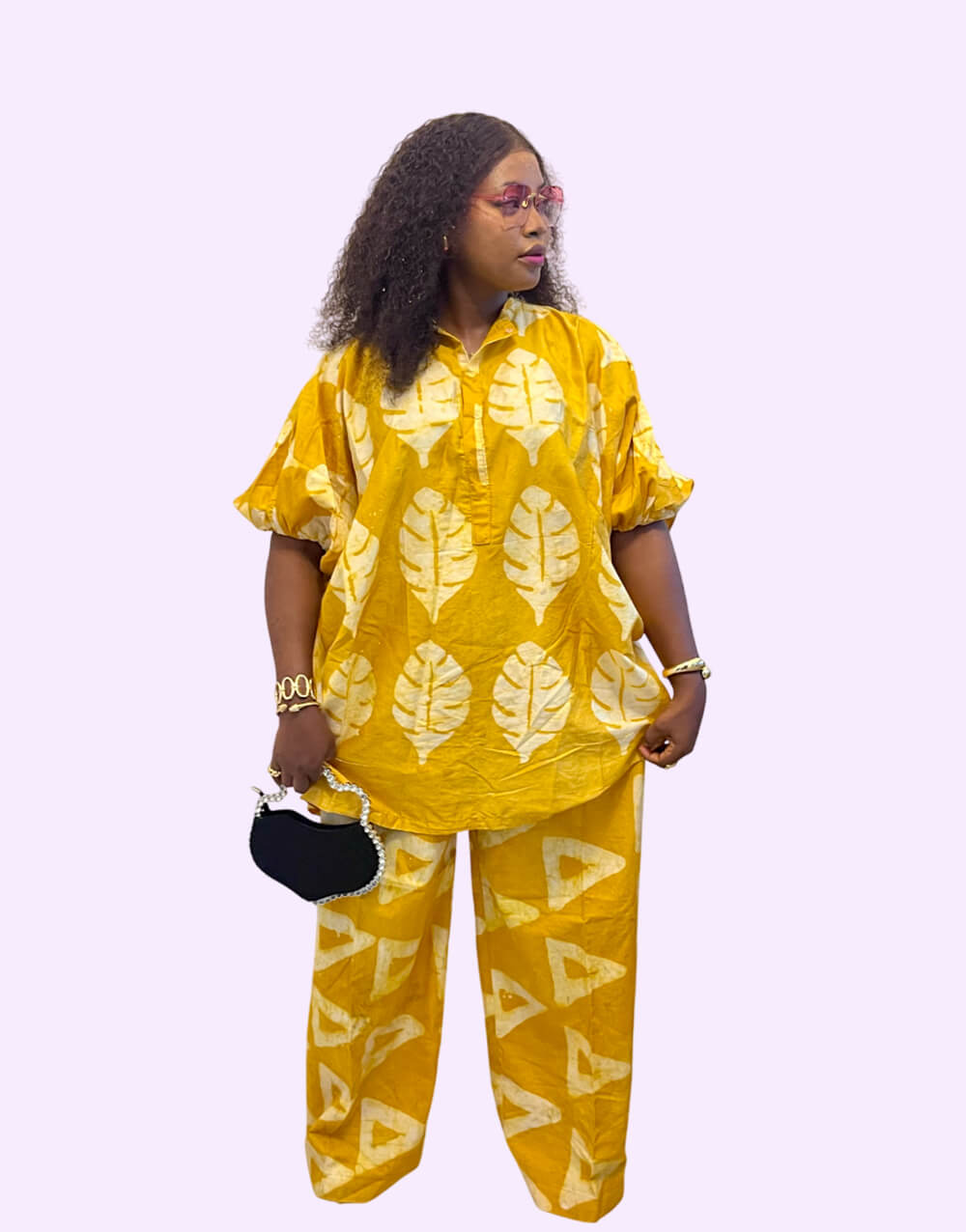 Radiate confidence and charm in this vibrant yellow Bubu top and Palazzo pants set, beautifully adorned with bold white leaf and geometric prints. Inspired by traditional African Adire craftsmanship, this ensemble combines cultural elegance with modern flair. The relaxed-fit Bubu top offers effortless comfort, while the wide leg Palazzo trousers ensure a flattering, free-flowing silhouette. Perfect for weddings, festive gatherings, cultural events, or casual outings, this outfit is crafted from breathable, high-quality fabric for all day comfort. Pair with statement accessories and your favorite heels or flats to complete the look.