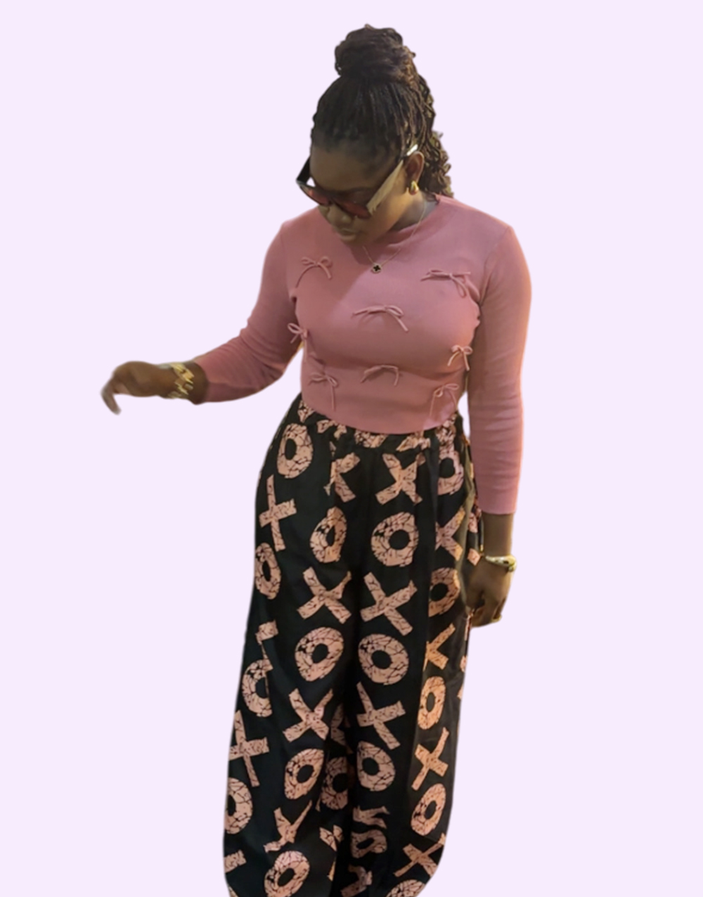 Discover your new favorite outfit with this stylish ensemble featuring bold Adire print palazzo pants. The unique ‘XOXO’ pattern in black and rose gold adds a playful yet sophisticated touch, perfectly complemented by a chic long-sleeve pink top. These comfortable palazzo pants are ideal for making a fashion statement, whether you’re out for a casual day or a stylish evening. Accessorized with elegant sunglasses and gold accents, this look exudes modern confidence. Elevate your wardrobe with our latest African-inspired fashion. Shop now to experience comfort, style, and unique design