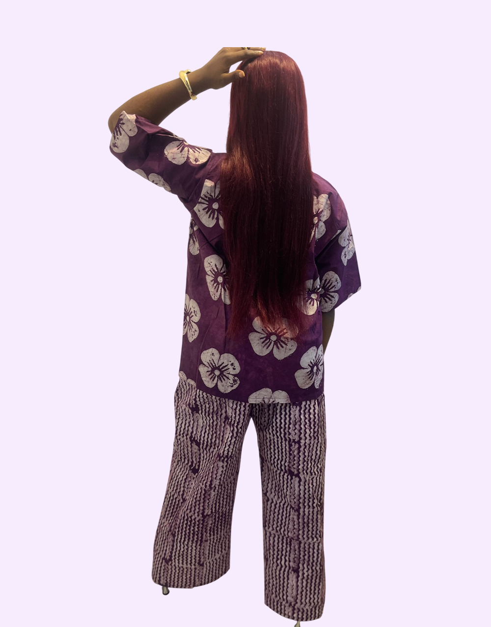 Step into sophisticated style with our elegant purple and white floral adire set! This charming two piece features a classic button down shirt adorned with beautiful white floral patterns, perfectly paired with matching pants that boast a complementary abstract print. Ideal for making a graceful statement at any event, this ensemble offers both comfort and undeniable chic. Elevate your wardrobe with this exquisite African-inspired set – shop now and shine!