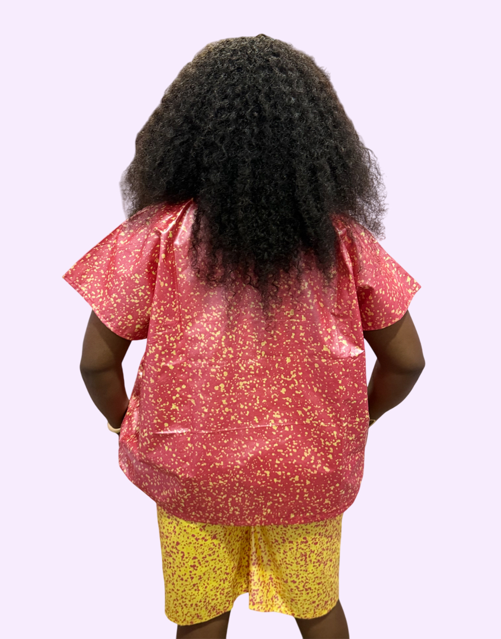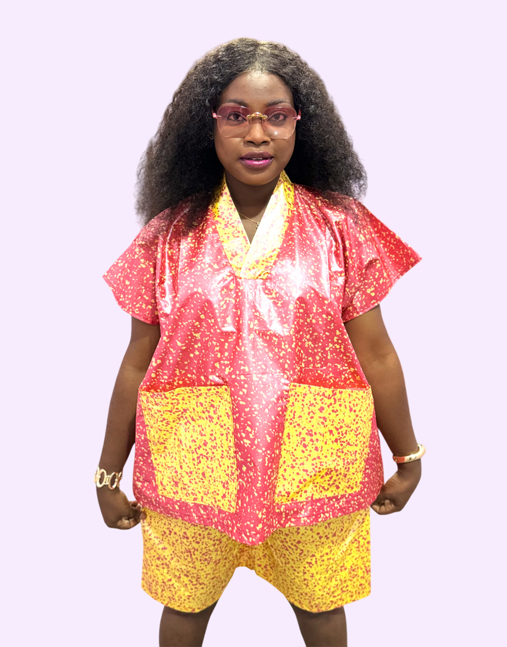 Inject some fun into your wardrobe with our vibrant red and yellow splatter ankara set! This playful two-piece features a stylish V-neck top with large front pockets and matching comfortable shorts. Perfect for sunny days and casual outings, this unique set is designed to make you stand out. Grab yours today and embrace bold, comfortable fashion! Limited stock – shop now!