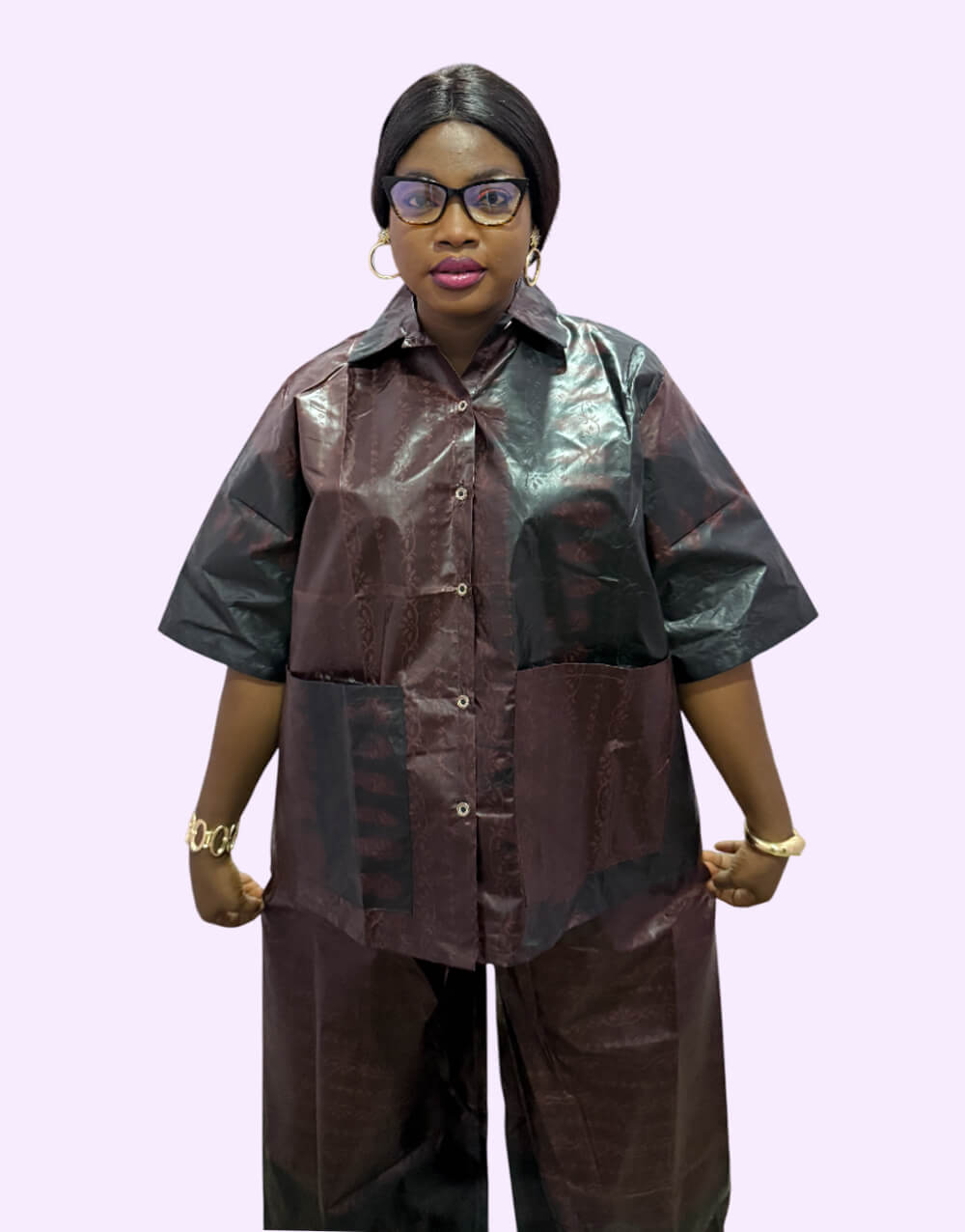 This sophisticated brown and black adire set includes a button-down shirt and wide-leg pants, featuring subtle geometric patterns for a chic and versatile look. Shop now!