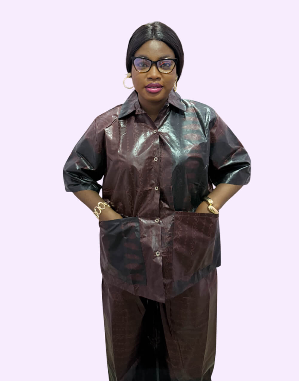 Discover understated elegance with our sophisticated brown and black adire set. This stylish two-piece features a button-down shirt with a relaxed fit and subtle patterned details, paired with matching wide-leg pants. Perfect for a polished yet comfortable look, this set effortlessly transitions from day to evening. Elevate your wardrobe with this versatile and unique African-inspired ensemble – shop now for timeless style!