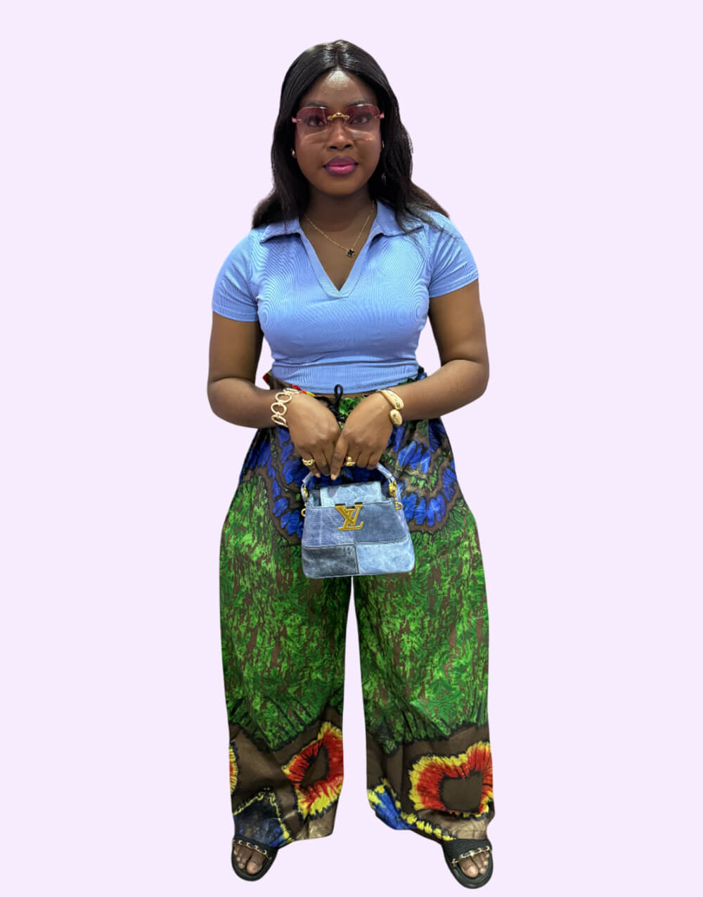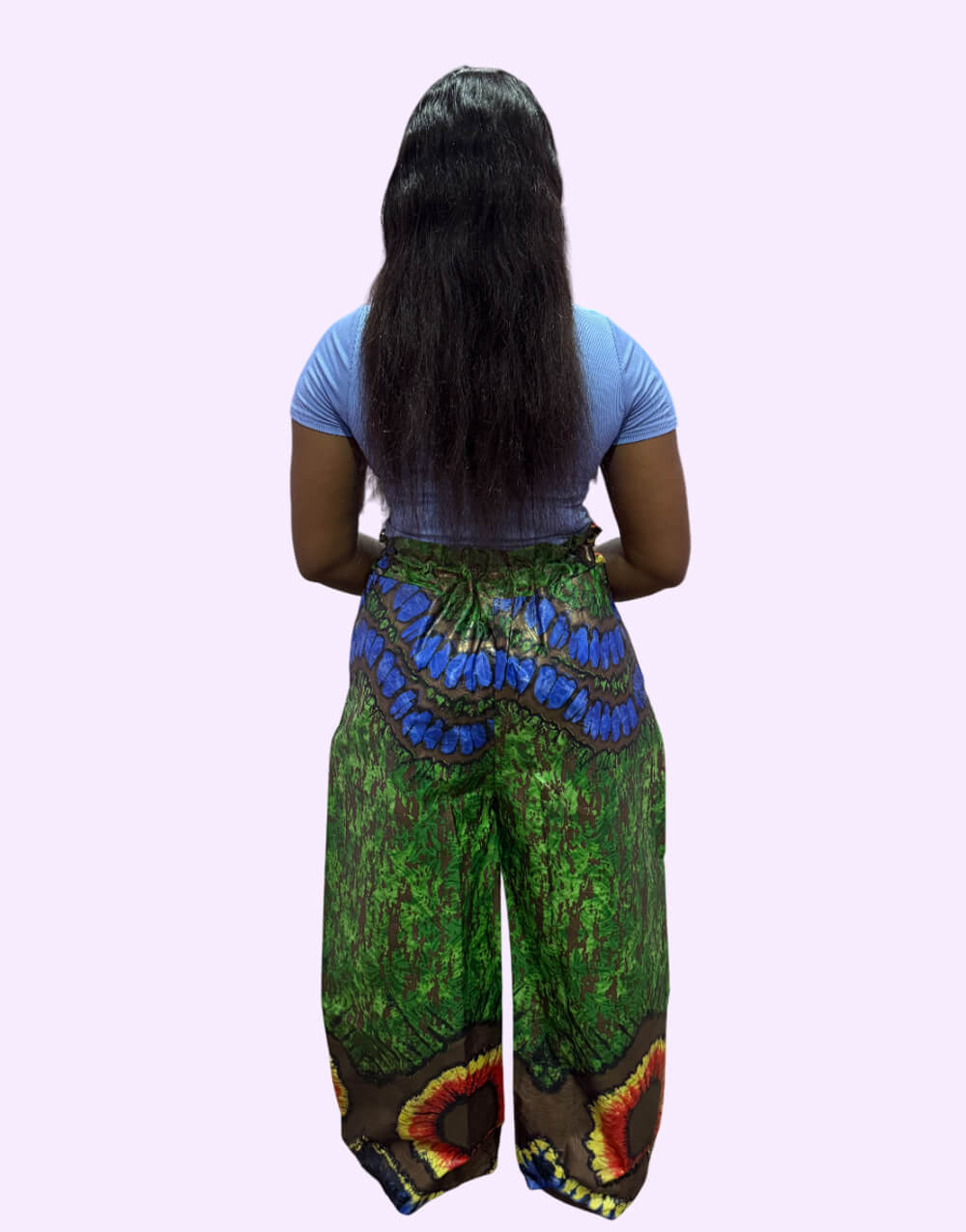 Transform your look with our stunning green and floral ankara pants! These comfortable, high-waisted trousers feature a rich green base adorned with vibrant floral patterns in blue, red, and yellow, creating an effortlessly chic and artistic statement. Perfect for adding a unique touch to your casual or semi-formal outfits. Step into style and confidence – shop these exquisite African-inspired pants today and make them yours!