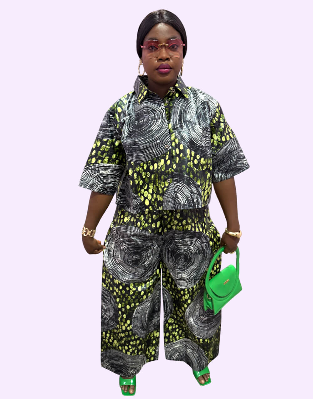 Make a fashion-forward statement with our trendy green and black swirl ankara co-ord set! This eye-catching two-piece features a chic button-down shirt and matching wide-leg pants, adorned with a captivating abstract swirl and dot pattern. Perfect for those who love unique designs, this ensemble offers both comfort and undeniable urban flair. Elevate your wardrobe with this must-have African-inspired set – shop now and turn heads wherever you go!