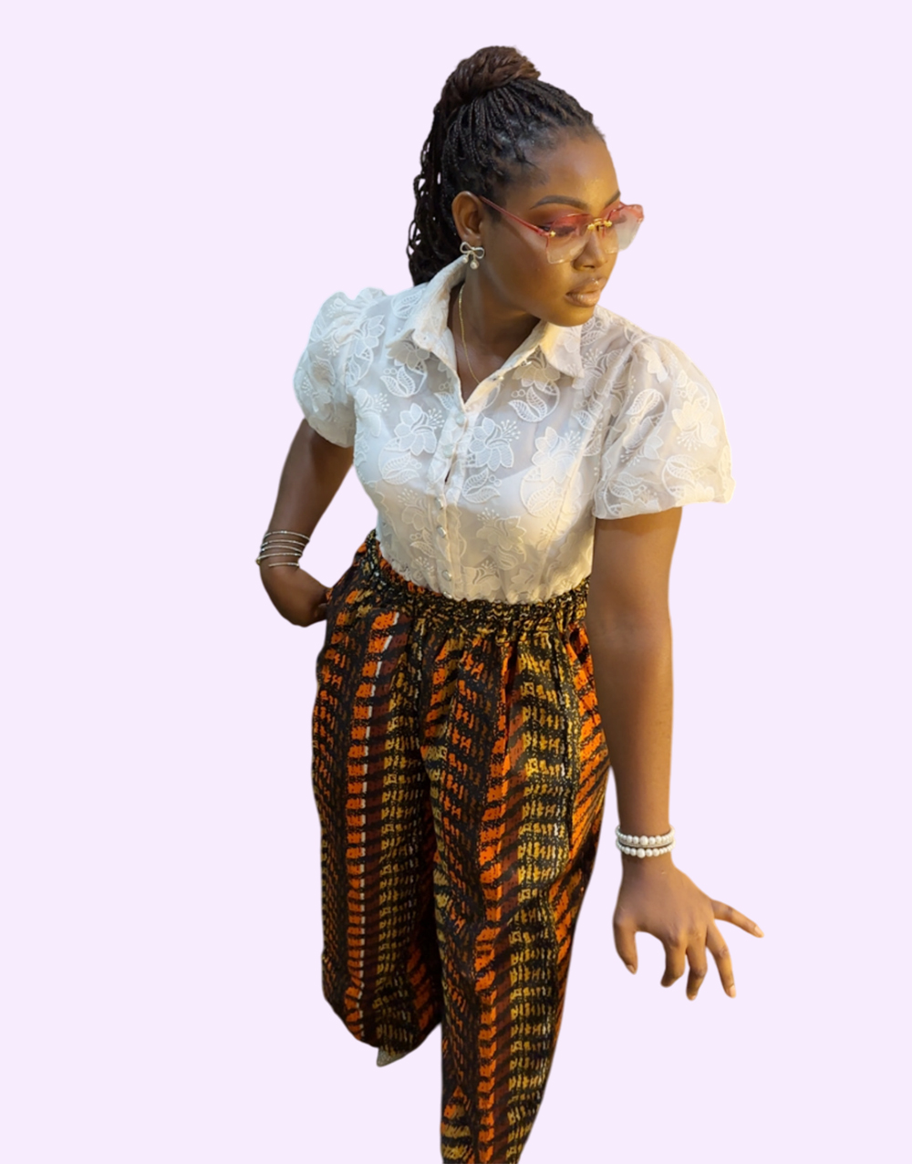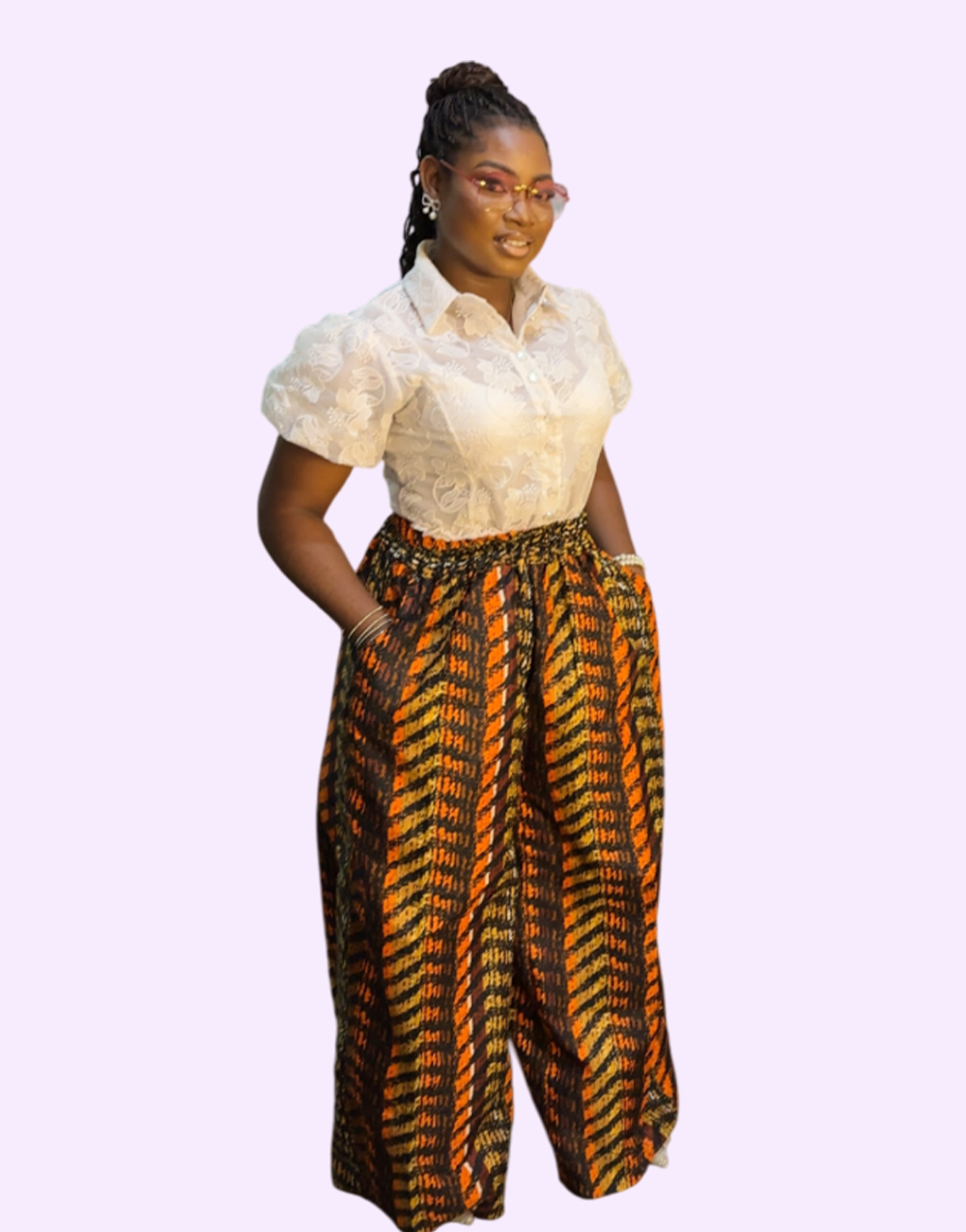 Make a bold statement with our stunning Ankara pants, featuring a vibrant orange and black striped pattern that captures attention. Paired perfectly with an elegant white puffed-sleeve blouse, this outfit offers a sophisticated yet playful look. These comfortable palazzo pants are ideal for both casual and semi-formal occasions, ensuring you stand out with unique style. The delicate details of the blouse and the striking print of the trousers create a harmonious blend of modern fashion and traditional inspiration. Elevate your wardrobe with this must-have ensemble. Shop our Ankara collection today and express your individuality