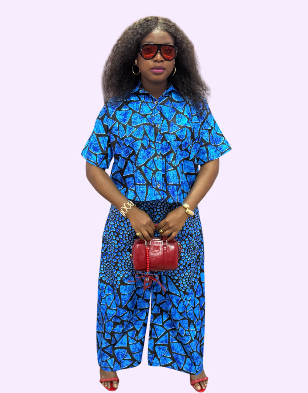 Dive into vibrant style with our captivating blue and black ankara set! This stunning two-piece features a chic button-down shirt and matching wide-leg pants, adorned with an eye-catching abstract shattered-tile pattern. Perfect for making a bold fashion statement, this ensemble offers both comfort and undeniable flair. Elevate your wardrobe with this must-have African-inspired set – shop now and stand out with confidence!